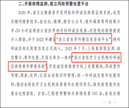 “浙江省医疗卫生机构科研诚信舆情案件管理系统”具备舆情监测、诚信警示、案件处置、负面名单等功能,实现信息早期预警、及时应对、全流程闭环管理。其中的诚信舆情案件线上处置模块,集案件受理、调查、处理、记录于一体,保障舆情案件处置全过程留痕。自2023年7月上线以来,累计提前预警舆情线索180余条,已成为高效提升全省医疗系统科研诚信工作的重要抓手。
