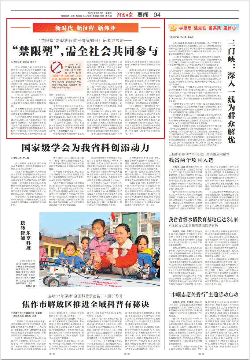 新规施行是一场触及习惯、触及经济利益的工作,更是一场关乎社会治理、生产生活的改革。“禁限塑”是一项改变人们生活和消费习惯的工作;以“禁限塑”为契机,我省能有效发展完整和领先的生物降解塑料产业链;开展好“禁限塑”工作,能更好推动现代化河南建设,助力美丽中国建设。
