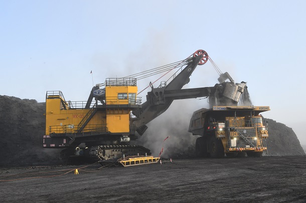 图为生产现场240煤炭运输车与35立电铲配合作业