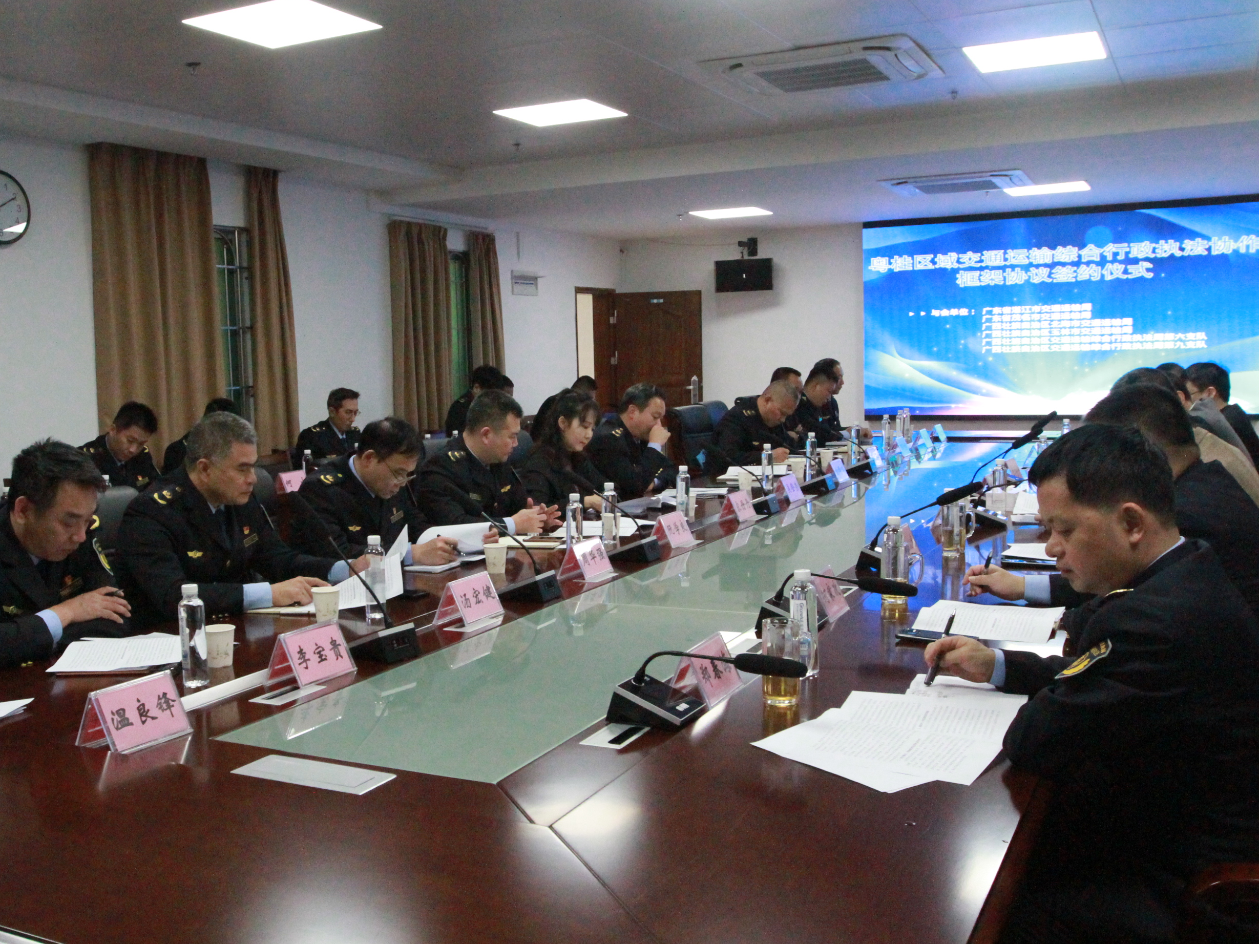湛江讯(通讯员?农环宇 李汉江 黄健伦 摄影报道)为打造共建共管共治的交通运输一体化治理格局,2023年12月29日,桂粤交通运输区域执法协作框架协议签订仪式在广东省湛江市举行,广西壮族自治区玉林、北海市交通运输局,广西壮族自治区交通运输综合行政执法局第六、第九支队,广东省湛江、茂名市交通运输局共同签订《桂粤交通运输区域执法协作框架协议》,至此,珠江流域及琼州海峡交通运输区域执法协作试点示范工作粤西桂东协同战线正式确立。