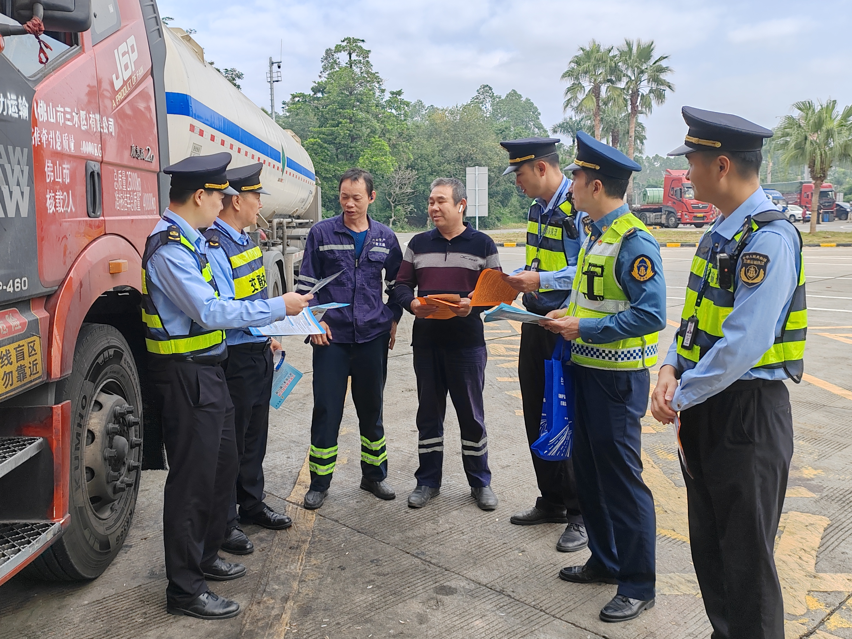 桂粤两地交通执法部门联合宣传队向货车司机宣传法律法规及行车安全常识。 (吴德行 摄)