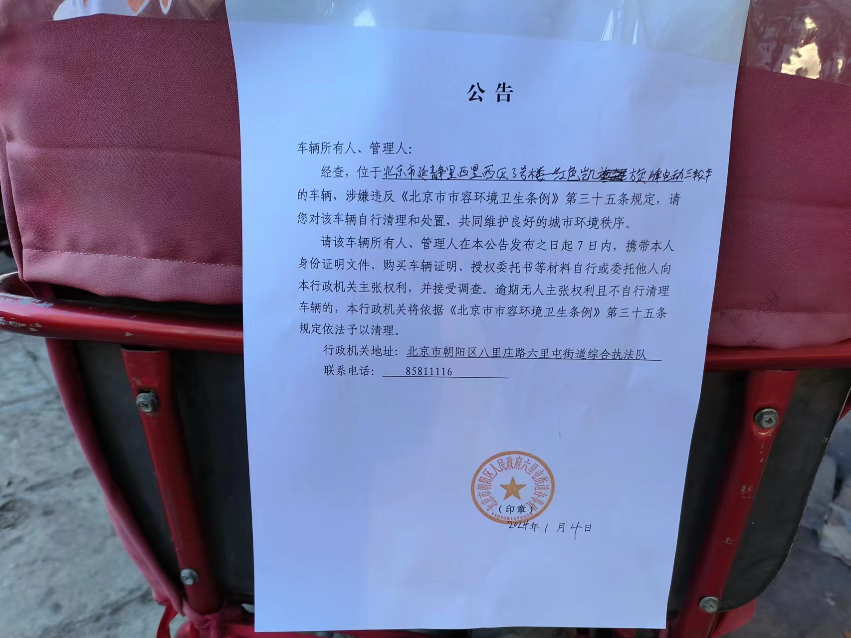 六里屯街道关于清理整治废弃电动三四轮车的公告(延静西里西区3号...