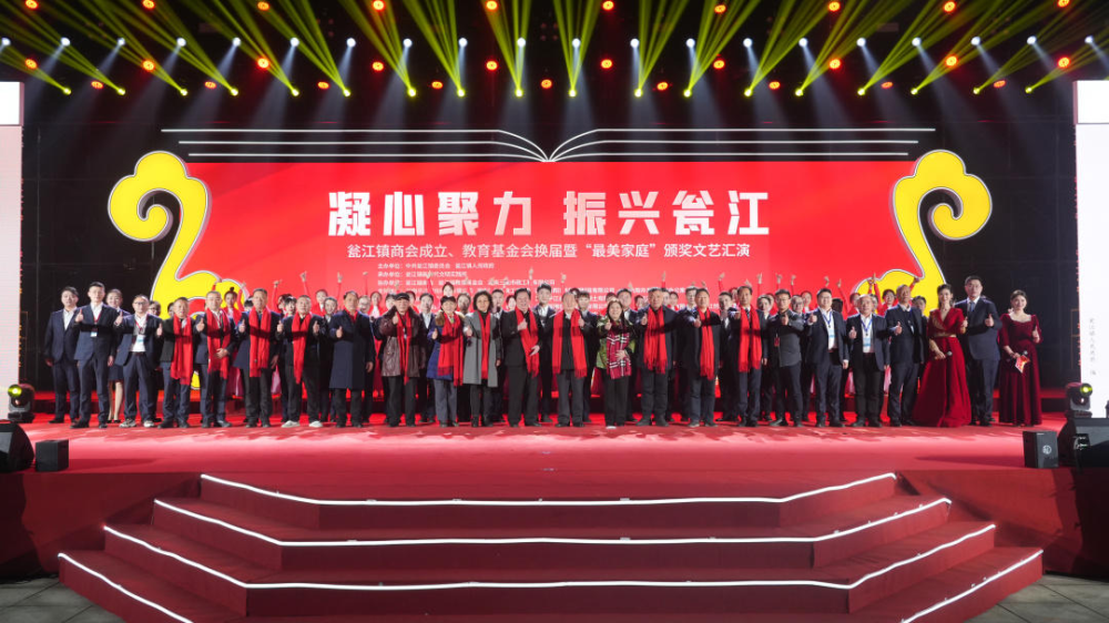演出穿插进行了瓮江镇商会成立,教育基金会换届、《瓮江》新书发布以及系列表彰颁奖活动。据悉,瓮江镇商会由一批热心公益、有社会责任感的企业家共同发起成立,旨在赋能瓮江发展,为会员提供一个交流合作的平台,促进会员之间的互利合作,共同开拓市场,提高竞争力。黄跃进,陈奇达等省、市、县领导一同上台,参与和见证瓮江镇商会的启动成立。