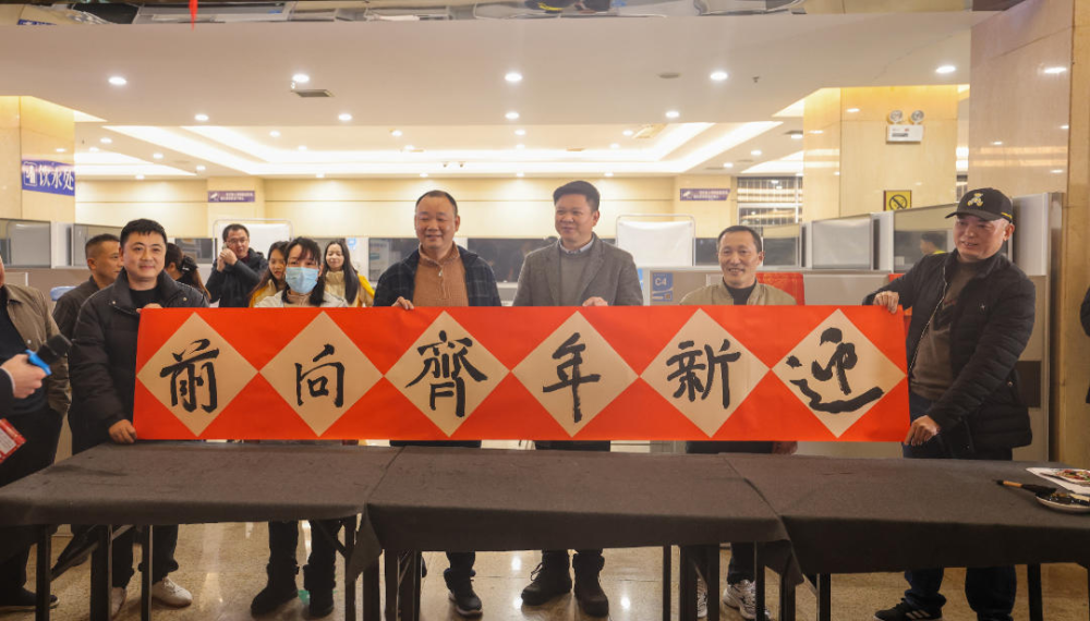 活动在一场由干部职工自编并演绎的舞蹈中拉开序幕,10余位书法爱好者撸起袖子,当场挥毫泼墨,献上自己的拿手好戏,或书写新年祝福,或赞美家乡,或歌颂家国情怀,为大家带来了一场视觉文化盛宴。