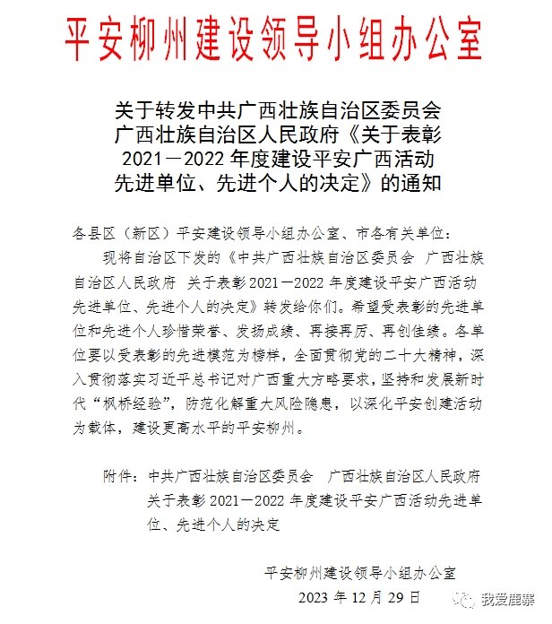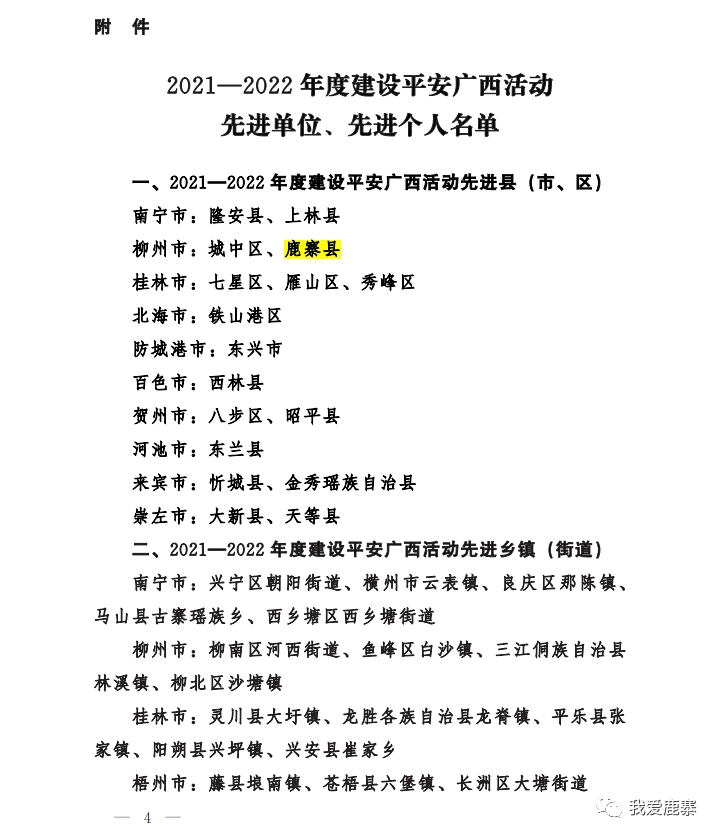 为表彰先进、树立典型,建设更高水平的平安广西,自治区党委、自治区人民政府决定授予隆安县等17个县(市、区)“2021-2022年度建设平安广西活动先进县(市、区)”称号,授予南宁市兴宁区朝阳街道等50个乡镇(街道)“2021-2022年度建设平安广西活动先进乡镇(街道)”称号,授予南宁市江南区检察院第一检察部等29个集体“2021-2022年度建设平安广西活动先进集体”称号,授予曹莉等198名同志“2021-2022年度建设平安广西活动先进个人”称号。其中,鹿寨县荣获“2021-2022年度建设平安广西活动先进县(市、区)”称号。