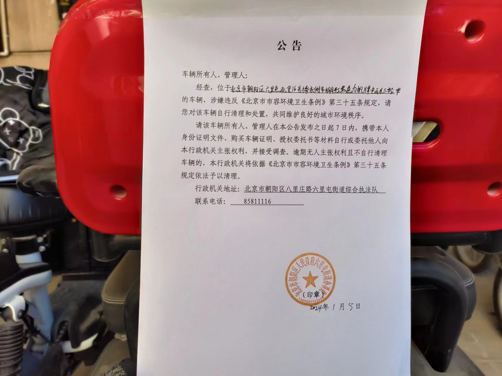 六里屯街道关于清理整治废弃电动三四轮车的公告(六里屯北里16号...