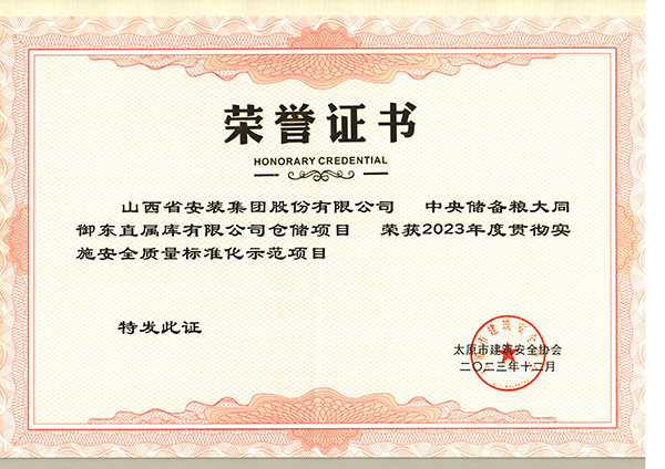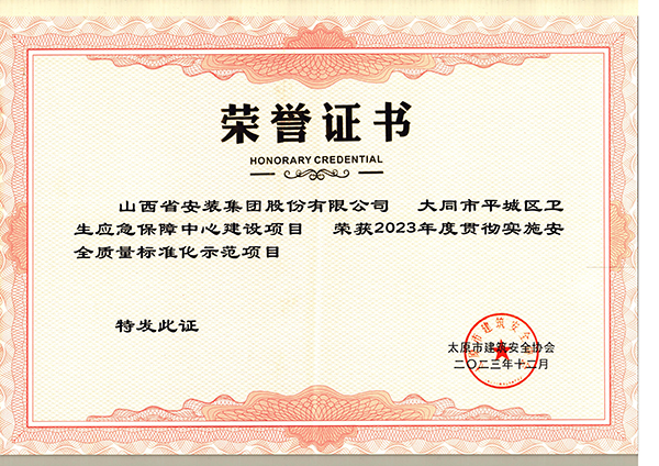 坚守山安品质,收获荣誉表彰。12月28日第四工程公司承建的中央储备粮大同御东直属库有限公司仓储项目,与大同市平城区卫生应急保障中心建设项目,同日荣获太原市建筑安全协会颁发的2023年度贯彻实施安全质量标准化示范项目荣誉证书。