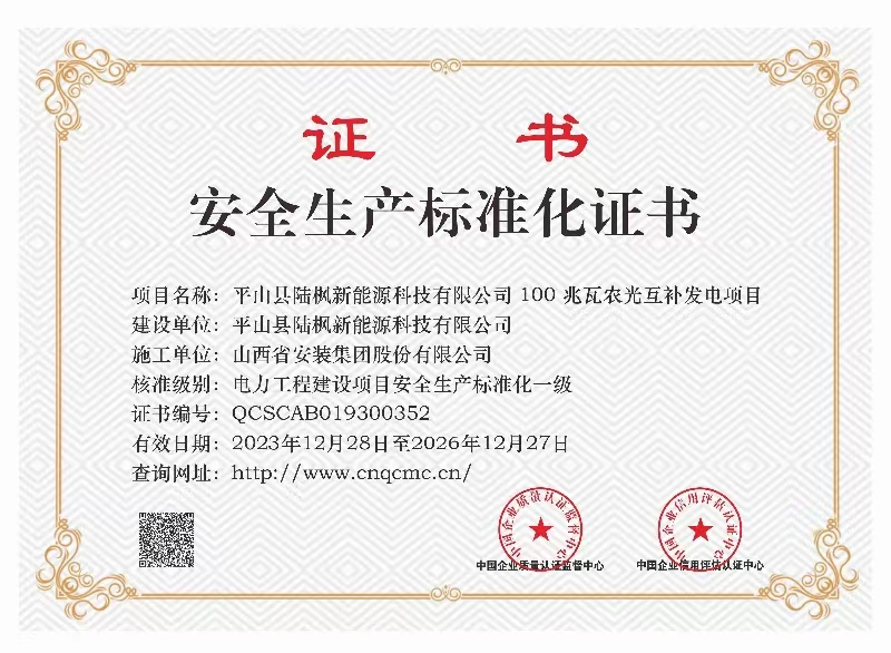 第二工程公司平山陆枫100兆瓦光伏项目荣获安全生产标准化证书