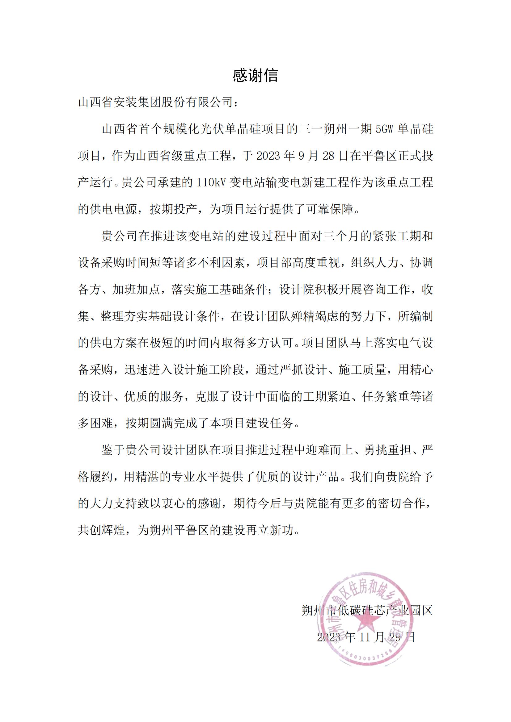 这封感谢信是对设计院和新能源事业部各项工作的高度肯定与鼓励。下一步,设计院将继续发扬优良作风,发挥攻坚克难、敢打硬仗的精神,持续做好项目技术支撑与技术服务工作,为助力朔州市平鲁区的建设贡献山安力量。