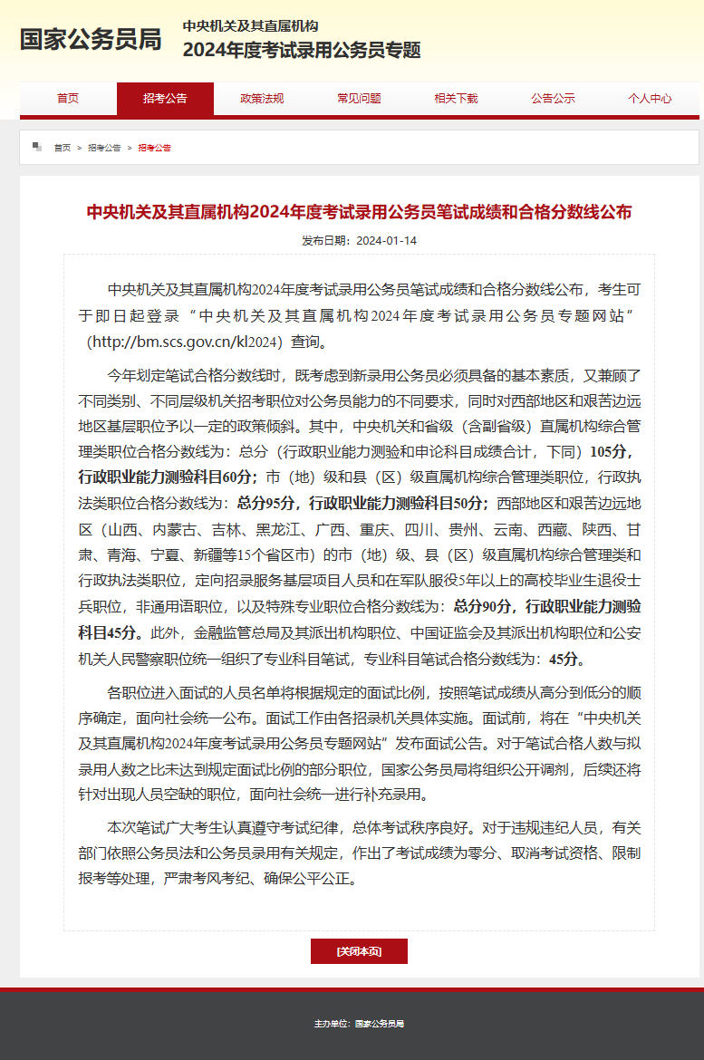 2024国考分数线公布!