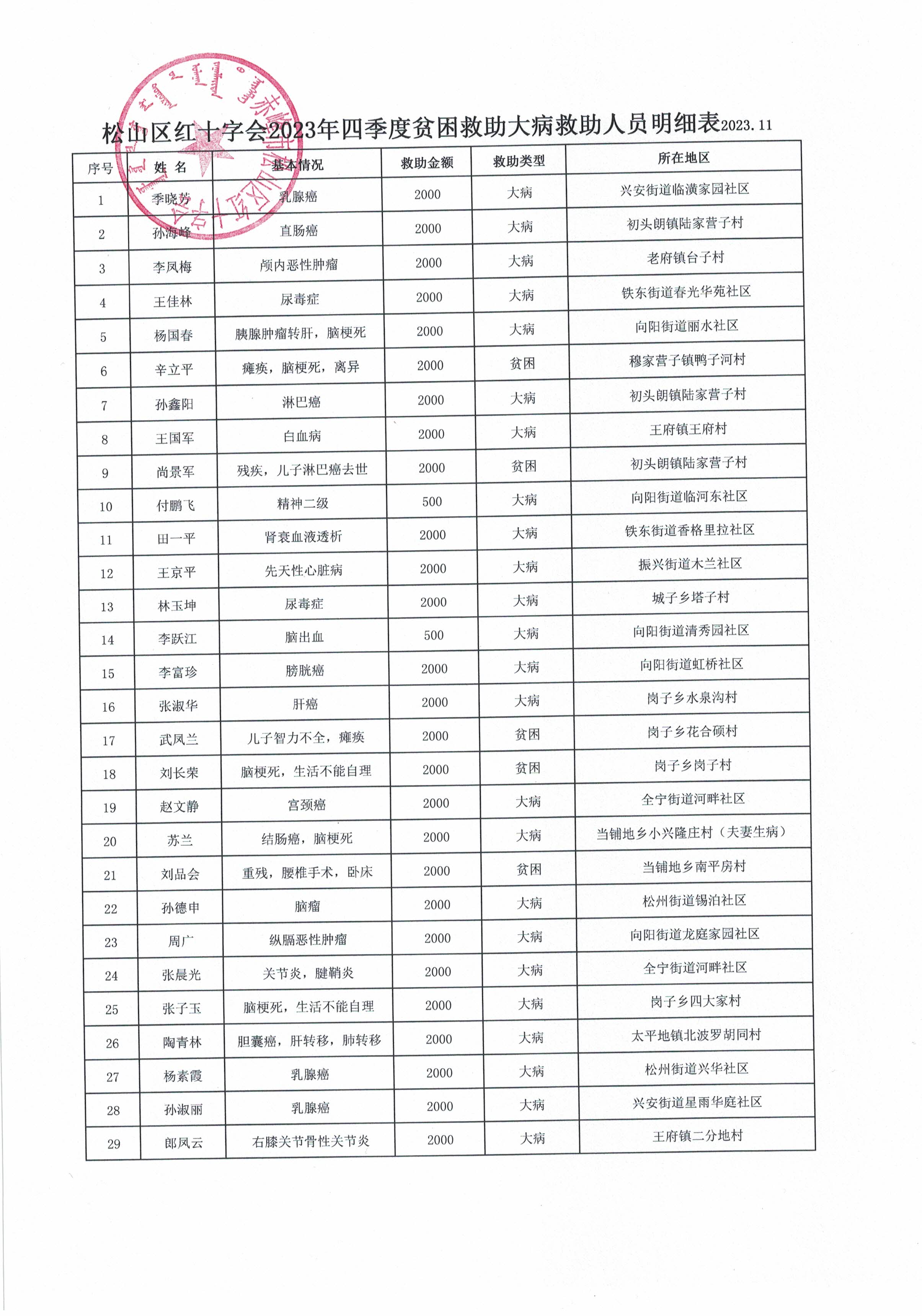 松山区红十字会2023年四季度贫困救助大病救助人员公示