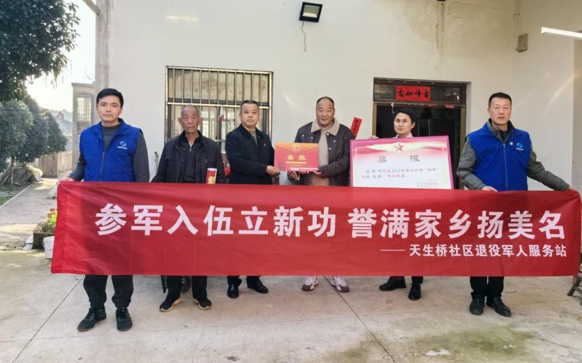 为进一步弘扬新时代拥军优属的优良传统,营造爱国拥军的浓厚氛围,1月13日下午,洪蓝街道退役军人服务站为荣获“四有”优秀士兵荣誉的天生桥社区现役军人陈煊家属送去喜报。