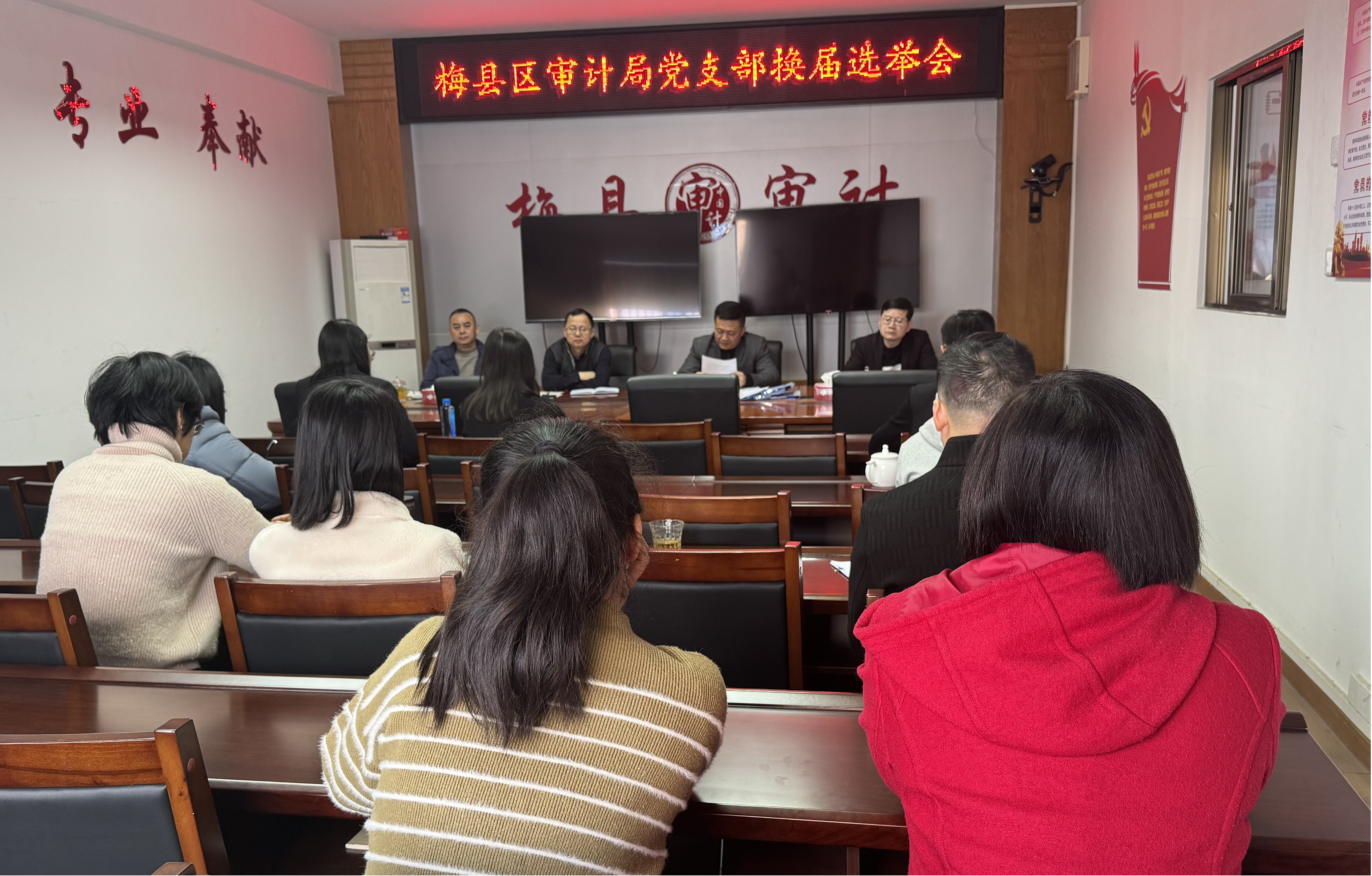 为进一步加强审计机关党组织建设,经报区政府系统党委批准同意,2024年1月8日上午,区审计局党支部召开换届选举会议,按照《中国共产党章程》《中国共产党基层组织选举工作条例》等规定选举产生新一届党支部委员会,区审计局党支部全体党员参加会议,会议听取上届党支部委员会工作报告,通过了选举办法和监票人、计票人、党支部委员会候选人预备人选名单,采取差额选举无记名投票方式,选举产生了5名党支部委员。随后,新一届支委会召开第一次会议,选举产生了党支部书记李晓斌同志,支委进行了分工。