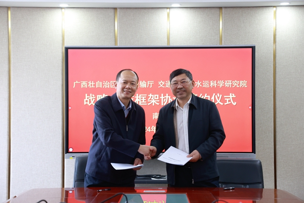 刘书斌对广西交通运输各项工作取得的显著成效表示肯定和祝贺,并表示,2023年,在交通运输部的正确领导和各地交通运输厅的支持下,交通运输部水运科学研究院积极推动智慧航道、智慧港口等重大专项工作研究,并推动相关意见出台,完成98项重点任务。当前,在加快建设交通强国等新时代背景下,中国港口生产经营仍保持良好发展势头,同时也面临着新的需求、机遇和挑战。广西水系发达、水网密布,平陆运河的建设为广西实现向海而兴、向海图强带来了新机遇。下一步,希望双方就智慧港口和信息化港口建设、港口运营管理等方面加强交流交融,深化沟通合作,共同谋划推进广西水运科技创新项目建设,为我国水运事业高质量发展提供支撑和保障。