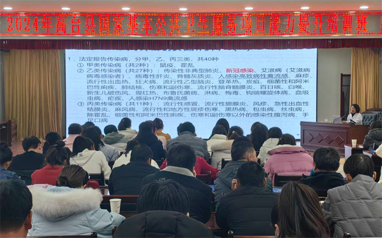 新年伊始,2024年国家基本公共卫生服务项目工作已悄然拉开序幕,为确保我县疾控类基本公共卫生服务项目顺利开展,提高基层医疗卫生机构公卫医师基本公共卫生服务能力,培养公共卫生复合型人才,2024年1月18日至1月19日,县卫生健康局主办、县疾控中心承办了2024年高台县国家基本公共卫生服务项目能力提升培训班。县卫生健康局分管领导及相关股室负责人、县人民医院、县中医医院公共卫生科负责人、各基层医疗机构分管副院长和公共卫生专干、乡村医师代表等120余人参加。