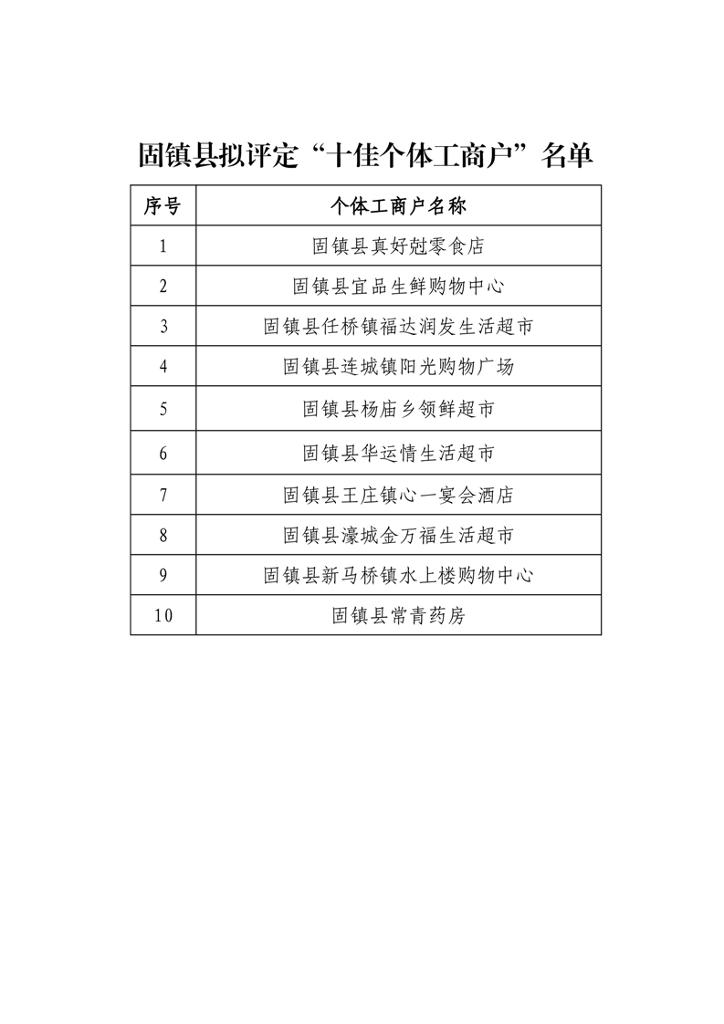 根据县委经济工作会议要求,经县市场监管局摸排、推荐和征求相关部门意见后,根据初步综合评审结果,拟评定如下全县“十佳个体工商户”,现向社会公示名单,接受社会监督。公示期:2024年1月22日-1月26日。期间如有异议情况反映,请拨打联系电话0552-2133022。