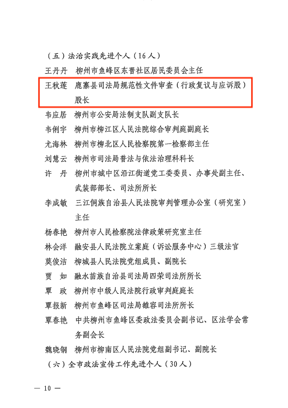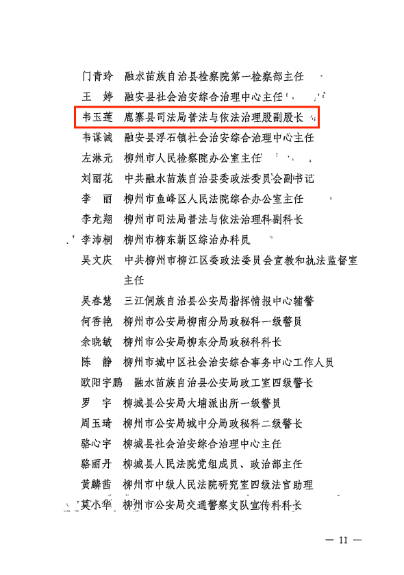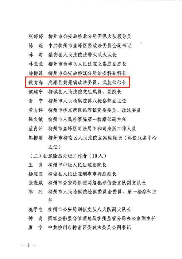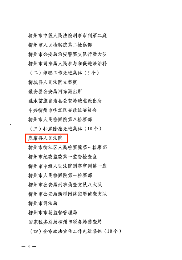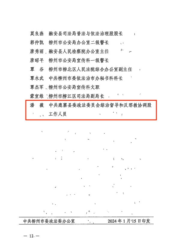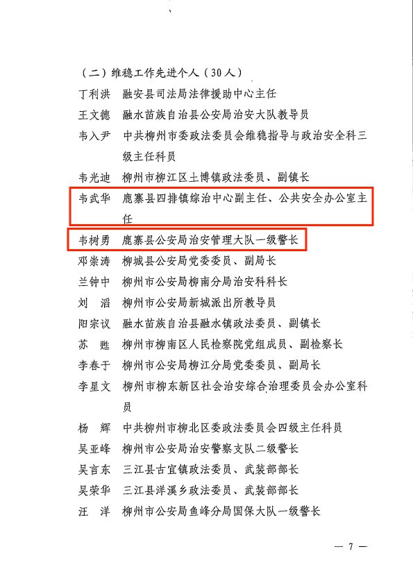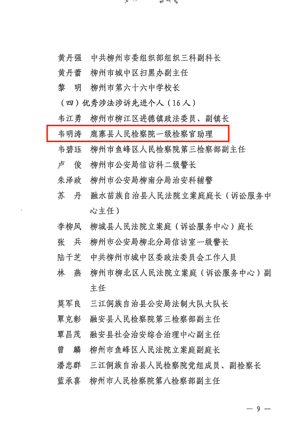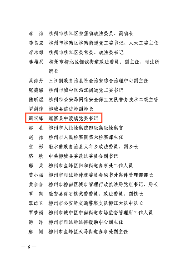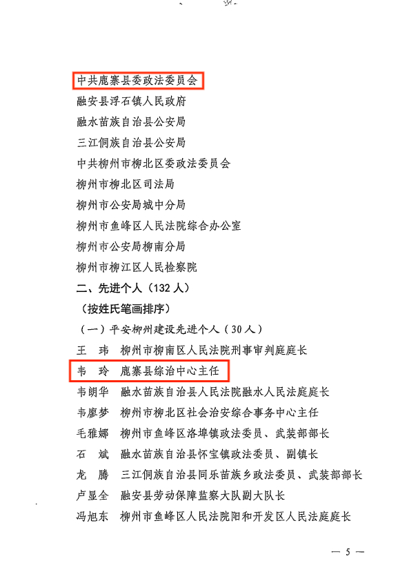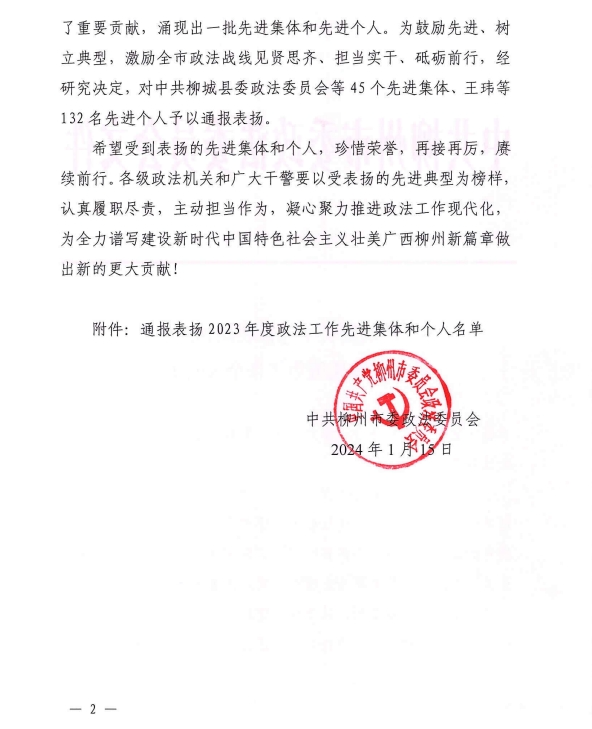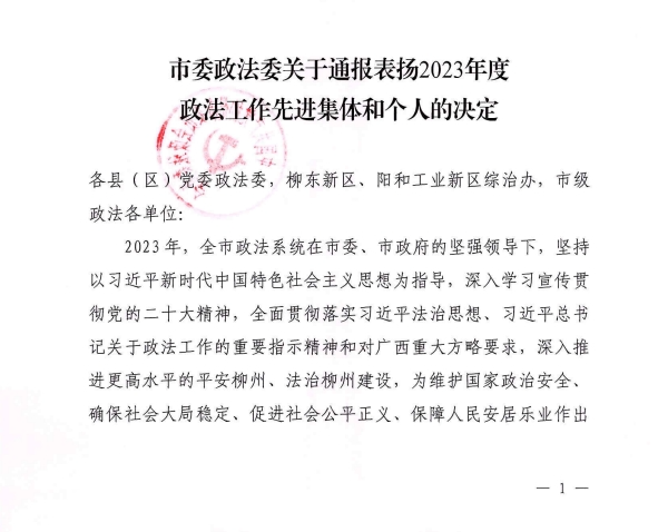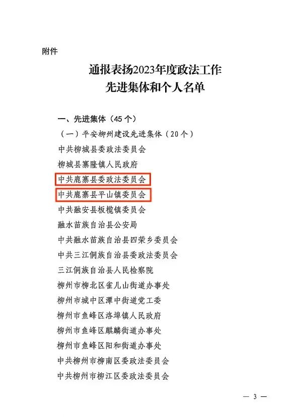近日,中共柳州市委政法委员会印发《市委政法委关于通报表扬2023年度政法工作先进集体和个人的决定》,对45个先进集体、132名先进个人予以通报表扬。其中,鹿寨县3个单位、9名个人上榜。