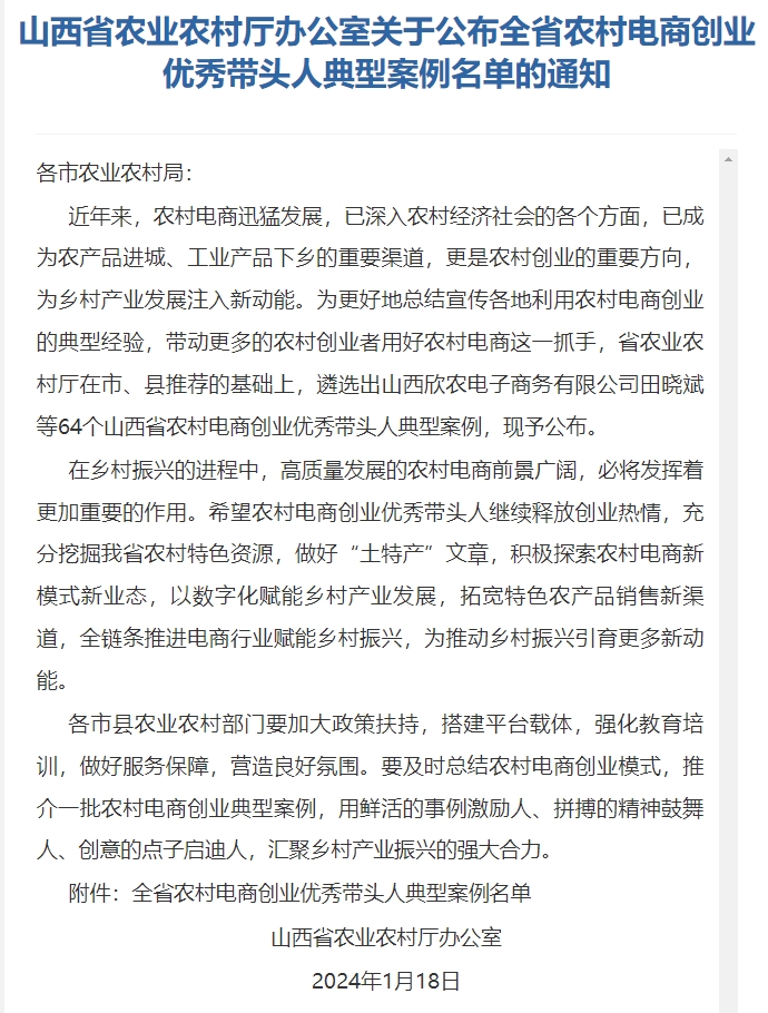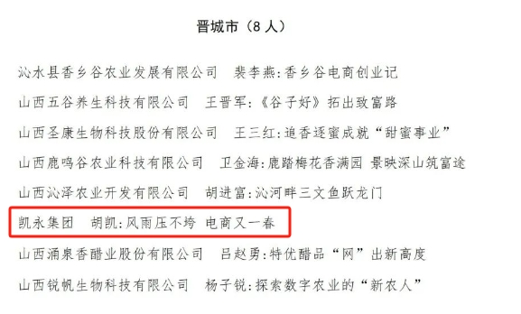 近日,山西省农业农村厅办公室公布全省农村电商创业优秀带头人典型案例名单,其中,我市凯永集团胡凯的案例《风雨压不垮 电商又一春》上榜。