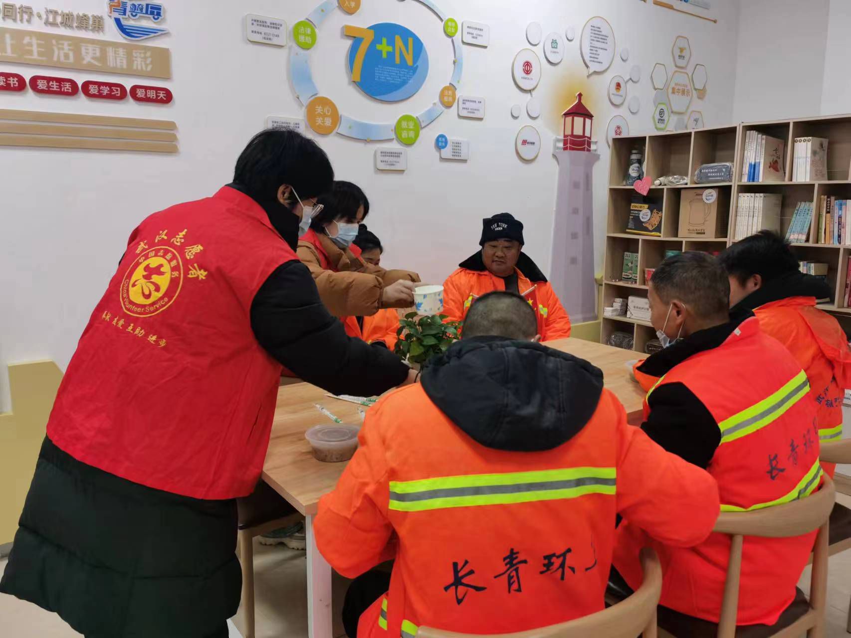 长青街兴达社区青年志愿服务队联合爱心商家开展腊八节送温暖活动,为寒冬中坚守工作在一线的环卫工人、快递小哥等户外劳动者送去腊八粥和节日祝福。