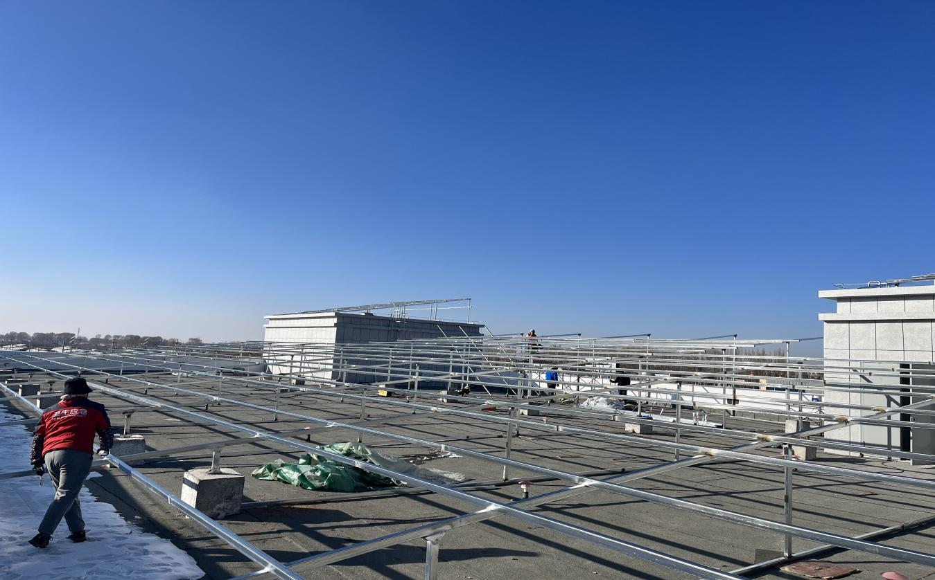 在职业中学施工现场,尽管寒风凛凛,但施工现场工人师傅各司其职,正在安装光伏支架,一片火热景象。此时正是学校放假时期,施工既不打扰学生上课学习和人身安全,又能在确保工程质量的前提下加快工程进度。