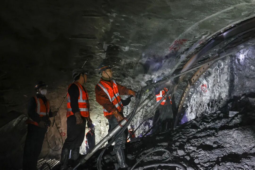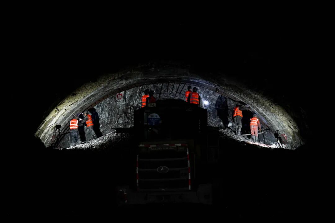1月12日,工人在纳赫高速陆家寨隧道内进行施工