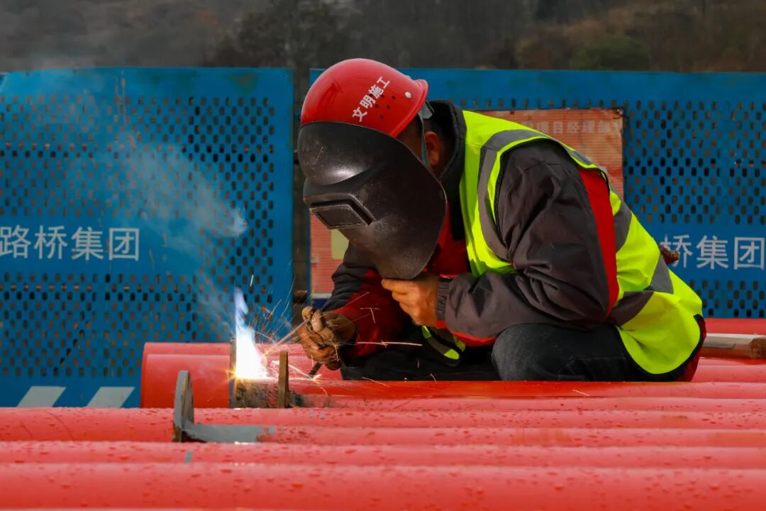 1月11日,工人在纳晴高速白水河大桥项目现场进行施工