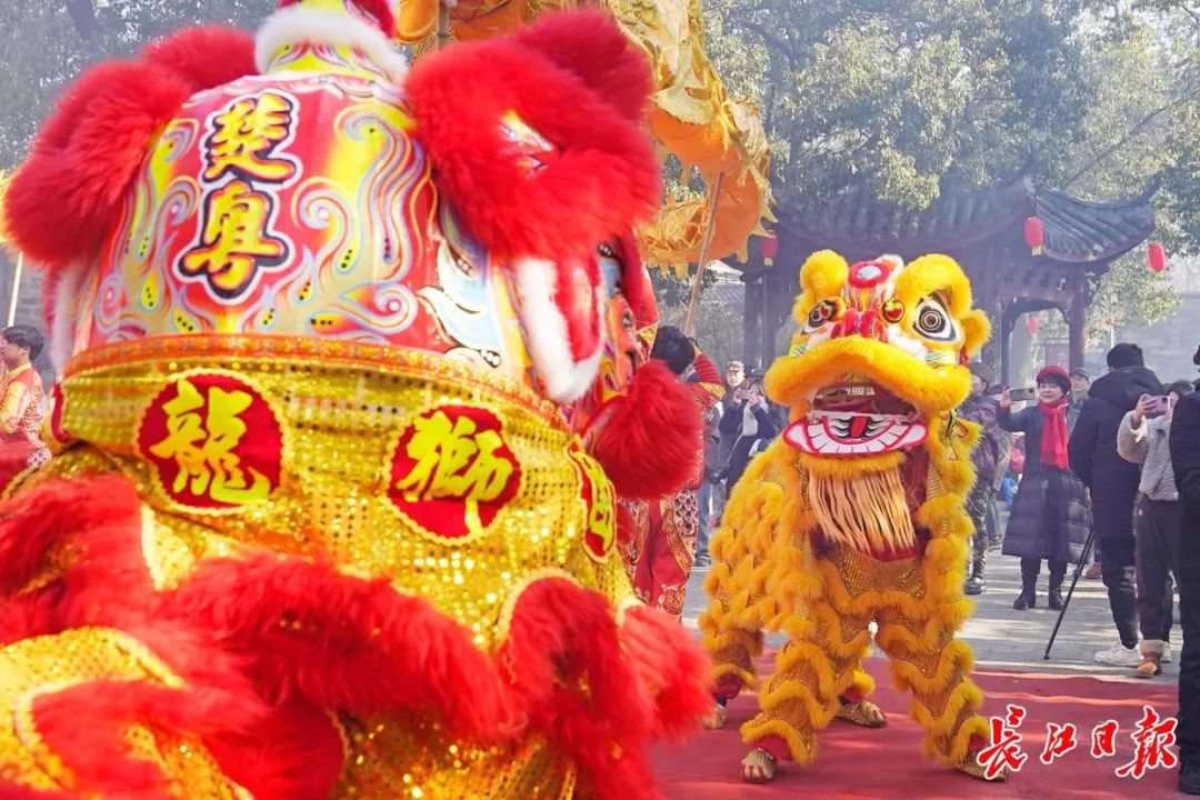 在大余湾景区有余广场,来自武汉楚粤龙狮团的表演者们神采奕奕,红黄相间的两只狮子伴着锣鼓点在现场腾挪跳跃,同游客热情互动。一条金色长龙在舞台中央时而摆出“中”字形,时而组成“龙”字形,现场不时响起阵阵叫好声。