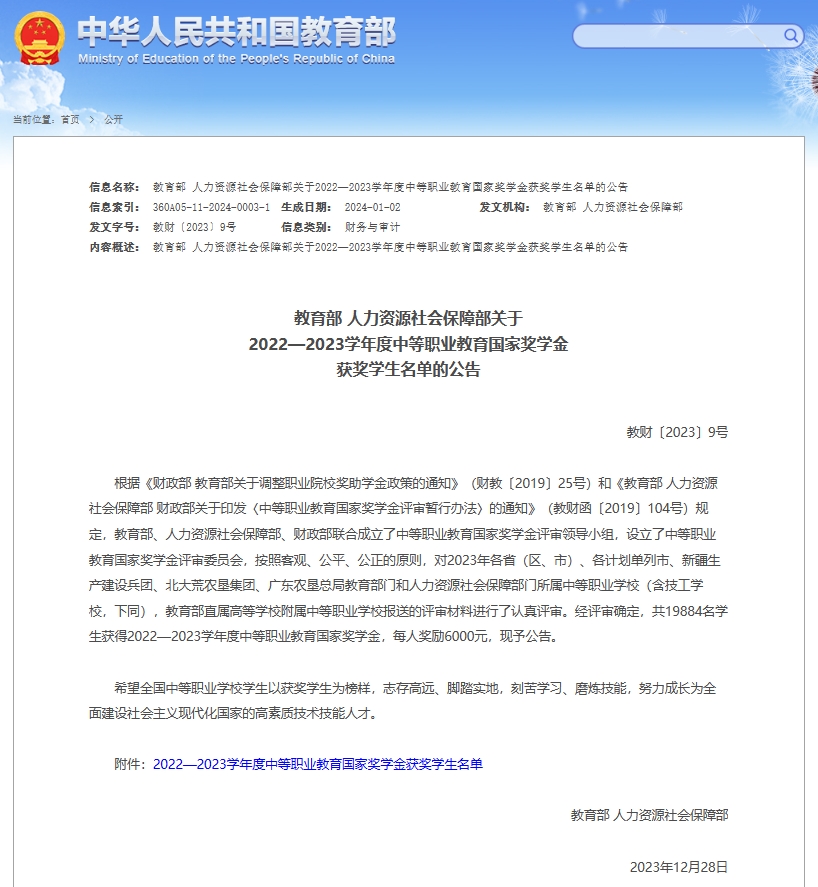 日前,教育部、人力资源社会保障部发布《关于2022—2023学年度中等职业教育国家奖学金获奖学生名单的公告》,我市2名中职学生荣获国家奖学金,每人奖励6000元。