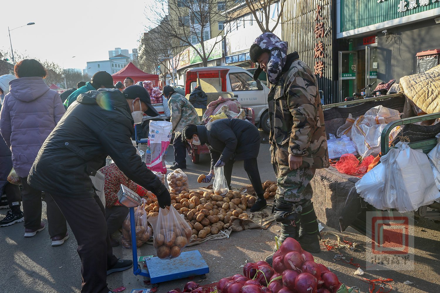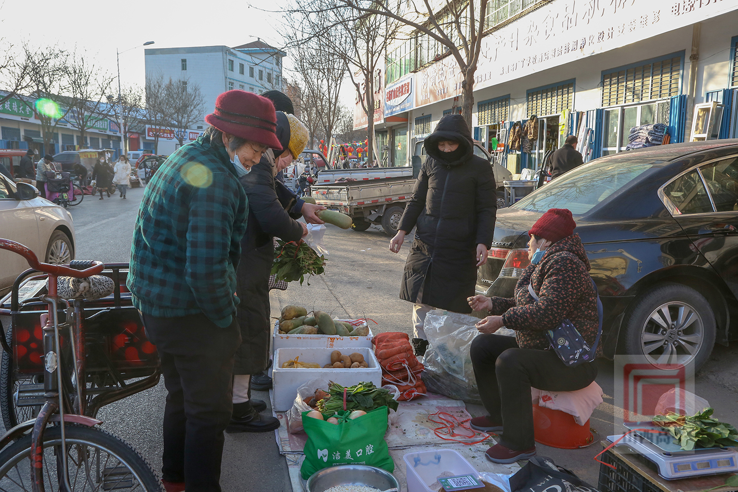 红火的年味就这样在拥挤热闹的早市里开启了,问候声、吆喝声、讨价还价声、叮咚付款声此起彼伏,一兜兜、一袋袋,不重样,大家脸上洋溢着幸福的喜悦,都盼着在外忙碌的亲人早点回家过年。
