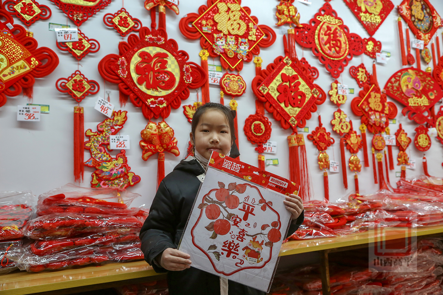 二年级学生陈雨航一边挑选窗花,一边开心地说:“马上就要过年了,爸爸妈妈带着我们来买年货,这个‘平安喜乐’的窗花是我挑的,希望新的一年家人平平安安、开心喜乐。”