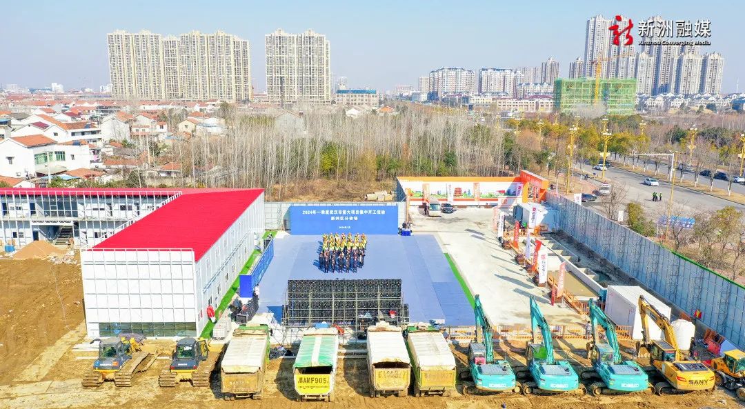 当天,武汉市举行2024年第一季度重大项目集中开工活动,伴随着开工号角的吹响,新洲分会场挖掘机高举摇臂,土方车齐声鸣笛。