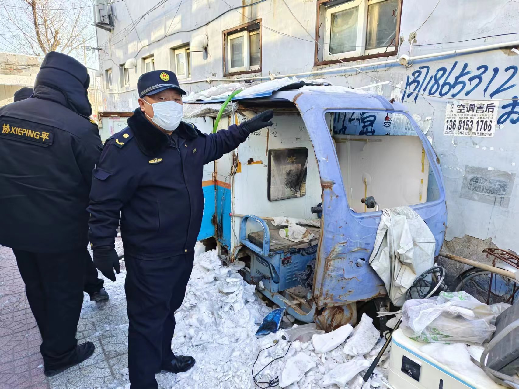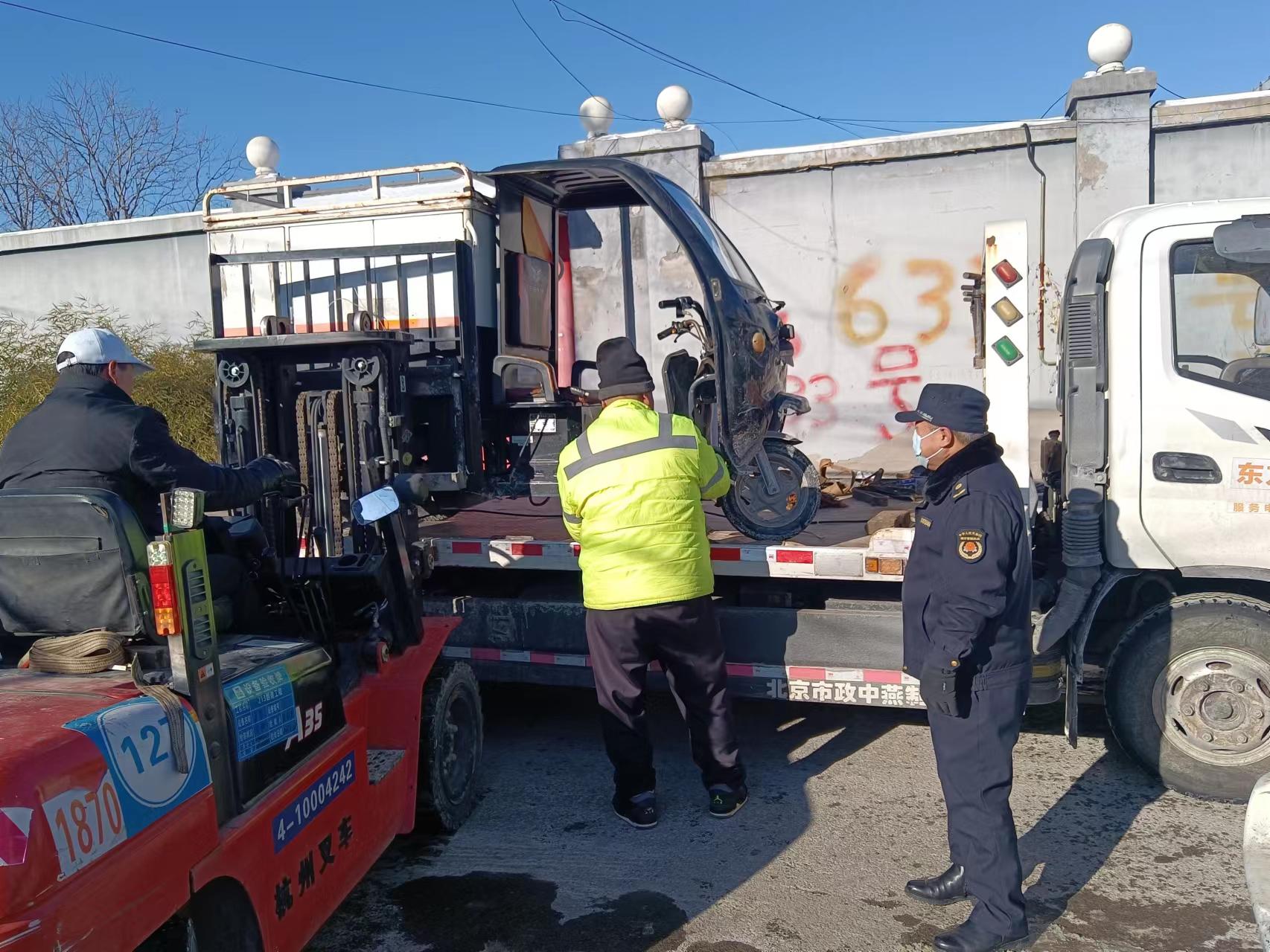 12月21日,王四营执法队对辖区废弃电动三四轮快递车进行清理整治。(通讯员 王四营 谢倩)