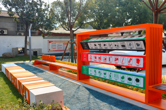 “垃圾分类绿园”占地约1200平方米,融入“绿色环保、再生利用、时尚生活、园林景观”设计元素,通过垃圾分类雕塑、展示牌、文化宣传墙、健身设施等多样形式宣传垃圾分类知识,打造了一个集休闲游乐、互动体验和宣传教育为一体的多功能垃圾分类主题场景。