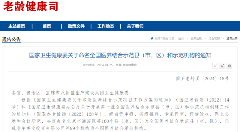 99个机构为全国医养结合示范机构