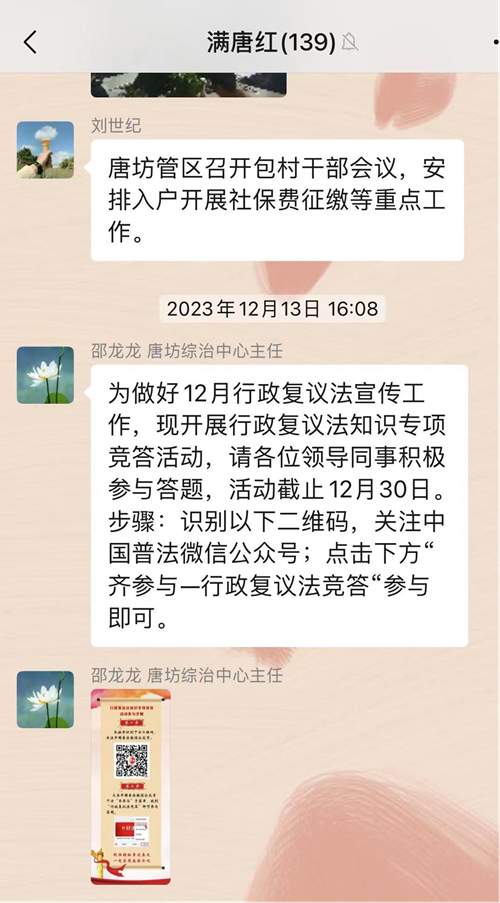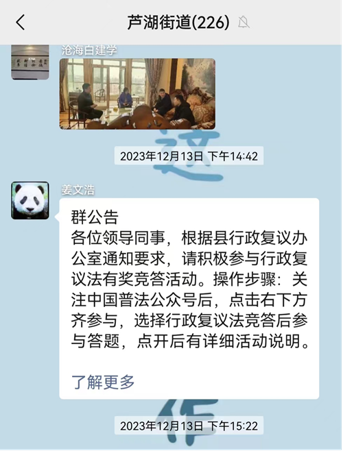 一是丰富普法形式,促新法广泛宣传。以文件形式督促行政机关工作人员每日开展网上复议法竞答活动,同时利用微信公众号、官方网站等网络平台发布新修订行政复议法的解读文章和相关资料,并通过各村微信群等广泛转载,方便群众随时查阅。