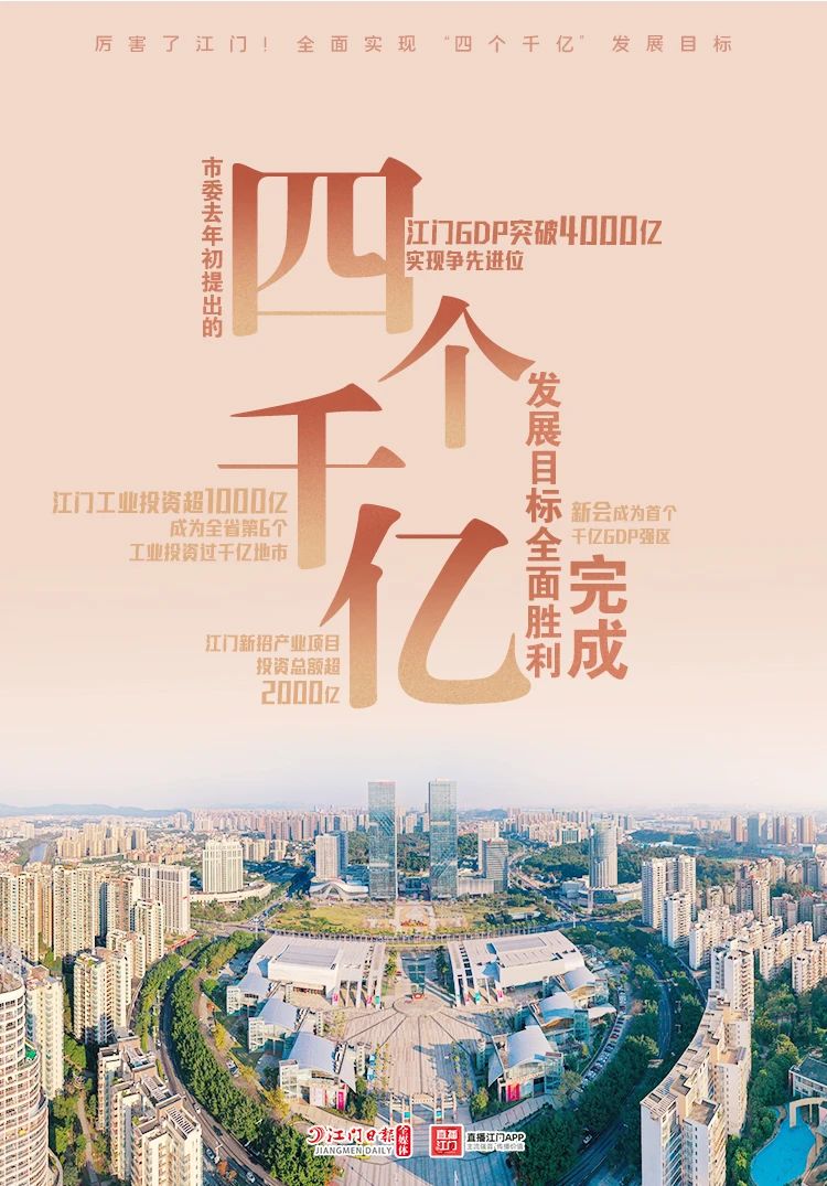 过去一年,江门全面实现“四个千亿”发展目标,地区生产总值4022.25亿元,成功争先进位,新会成为首个千亿GDP强区,全市新招产业项目投资总额2100.8亿元、完成工业投资超千亿元,经济社会发展取得新成效。经济回升向好,多项主要经济指标增速高于全省,其中地区生产总值增长5.5%,规模以上工业增加值1455.19亿元、增长6.8%、排全省第3,地方一般公共预算收入增长5.4%,居民人均可支配收入增长5.2%。