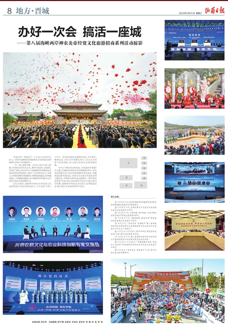 外宣工作再创新高。在国家级、省市级媒体发稿4159篇,在人民日报发稿11篇,在中央电视台发稿16条,山西卫视发稿133条,学习强国发稿462篇,连续多年位列晋城第一。特别是第八届海峡两岸神农炎帝经贸文化旅游招商系列活动宣传工作,实现了“百家媒体聚焦高平、千篇稿件对外发布、一亿人次线上拜祖、八亿流量破圈传播”,让炎帝文化IP再度引爆网络。