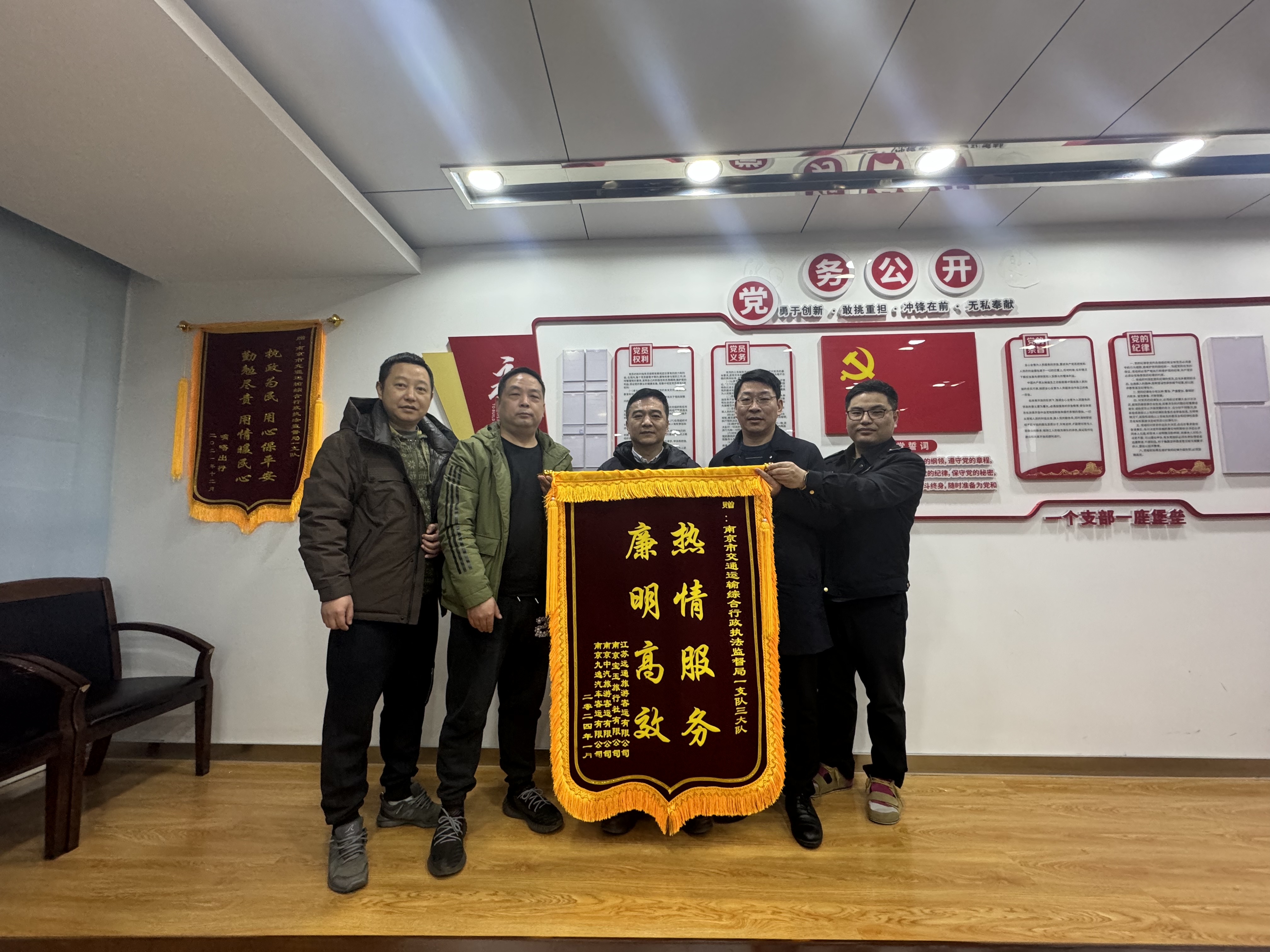 2月1日上午,南京中汽旅游客运有限公司、江苏远通旅游客运有限公司、南京九逸汽车客运有限公司、南京宝玉旅游有限责任公司联名向市交通综合执法局一支队赠送一面印有“热情服务 廉明高效”的锦旗,以表达感谢之情。