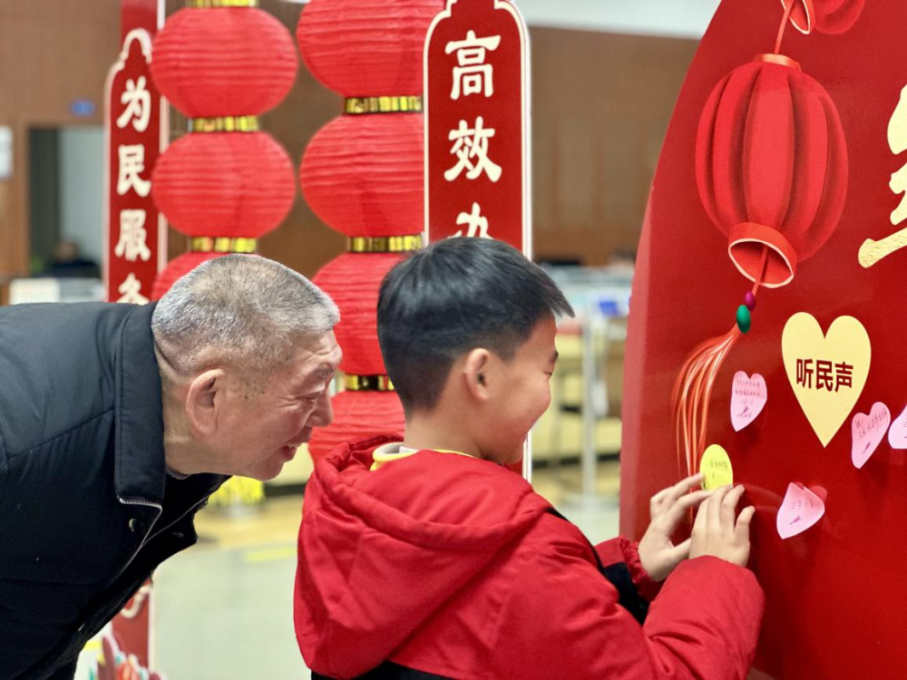 政务服务心愿墙,留下意见建议和新春祝福的市民可获得福字或对联。