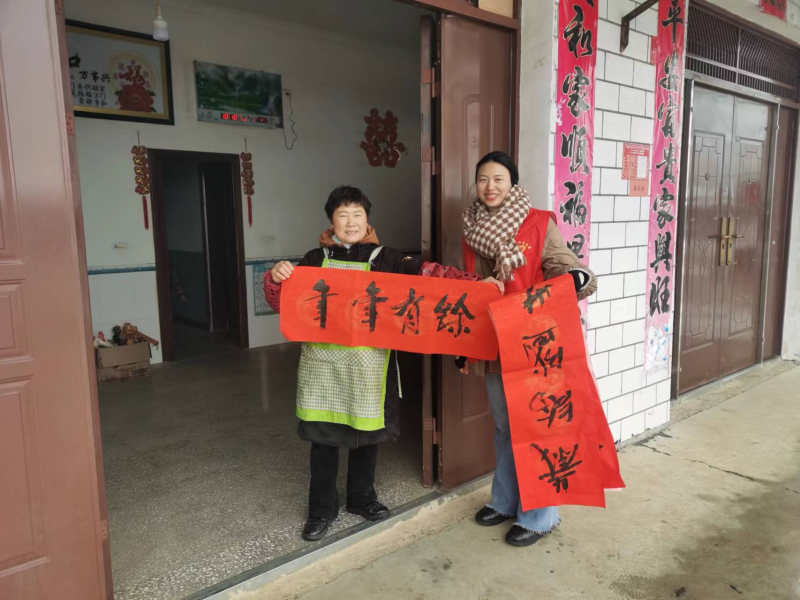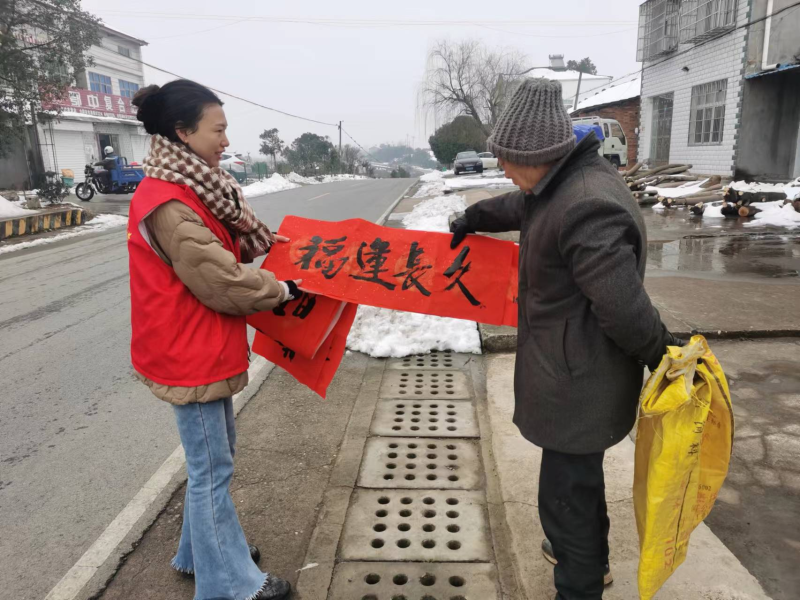 近期雨雪冰冻天气让大家出行不便,七里冲村新时代文明实践志愿服务队结合关爱特殊群体开展的“敲门行动”,为村民送去了春联、送上了祝福,把文化的“种子”种在了大家心中。“正愁咋上街去买呢,你们就送来了,非常谢谢!”82岁的邓爷爷脸上洋溢出幸福的笑容。