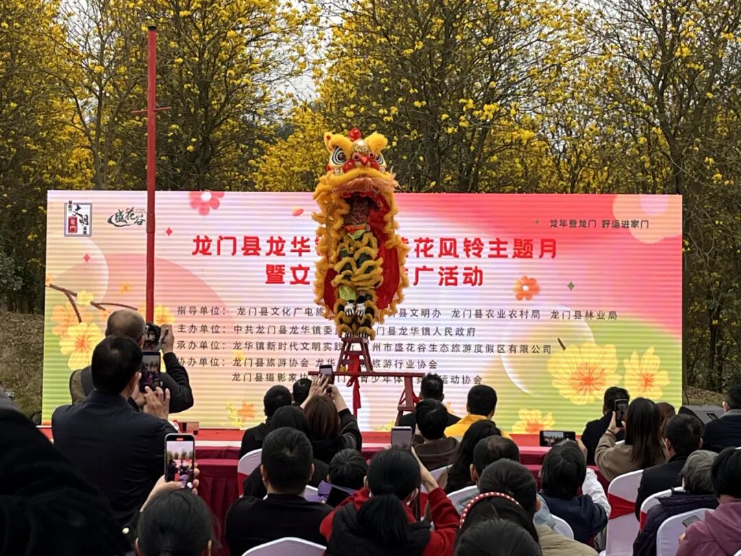 黄花怒放诗千树,彩蝶知音韵九春。2月29日上午,龙华镇盛花谷生态旅游度假区人头攒动,一场以“黄花风铃”为主题的文旅盛宴为广大市民和游客热烈呈现。 活动在龙石头醒狮表演烘托的热烈气氛下拉开序幕,随即龙门农民画旗袍秀、《看山看水看中国》舞蹈秀等表演向市民和游客展示了龙门的人文风采,现场还有“岁岁红”年桔、马嘶紫玉淮山面、西溪竹笋、长滩河粉、双东沃柑、水坑兰花等农特产品供市民和游客品尝购买,精彩的表演和美味的特产让大家连连称赞。 市民余女士:我觉得这次活动非常精彩,能让外地的游客看到龙门这么漂亮,是一个非常好的宣传。 走进黄花风铃木的“花花世界”又迎来了一番好景色。只见一树树黄花风铃木远观似黄金璀璨,近看如风铃摇曳,没有绿叶衬托的一簇簇黄花缀满枝头,绽放成一片金色花海,绘就一幅美丽生动的大自然春日画卷,游客们流连其中,纷纷拍照“打卡”。 游客曹女士:我们来自深圳龙岗。这里好漂亮,地方也很大,这些花真的太漂亮了,很惊艳。 龙华镇首届黄花风铃主题月暨文化旅游推广活动,旨在深入贯彻落实“百千万工程”,进一步提升了我县旅游整体形象,推动龙门文旅产业高质量发展。 龙华镇宣传委员伍炬龙:下来,我们将进一步提升旅游发展环境,积极开发旅游产品,推动旅游市场服务管理体系的全面升级,大力发展乡村旅游,全面推动我镇经济社会各项事业高质量发展。