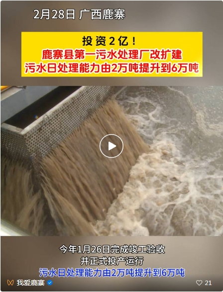【创文明城市】总投资2亿元!鹿寨县第一污水处理厂日处理污水6万吨!