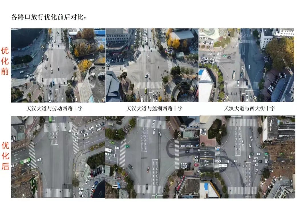 据近期数据统计对比,自天汉大道中段优化调整后,拥堵指数下降10%,交通通行效率提升16%,平均车速提高11%,高峰期排队缩短20%。 天汉大道作为中心城区主干道,车流量大。经现场勘察,对有条件的川前街、西大街与天汉大道连接处进行渠化展宽,通过开挖人行道、设置交通指示等措施,将非机动车道与机动车道明确分隔,告别“机非混行”,有效缓解交通高峰时期道路拥堵的情况。 天汉大道南北方向直行车道车流量大,左转车道车流量相对较少,交警部门调整七个十字路口通行方式,清除左转待行标线,划定直行待行区标线,平均每个路口一个信号周期内可多通过16-24辆车,同时直行车辆进入待行区后右转车辆也能得到有效放行,通行效率明显提升。