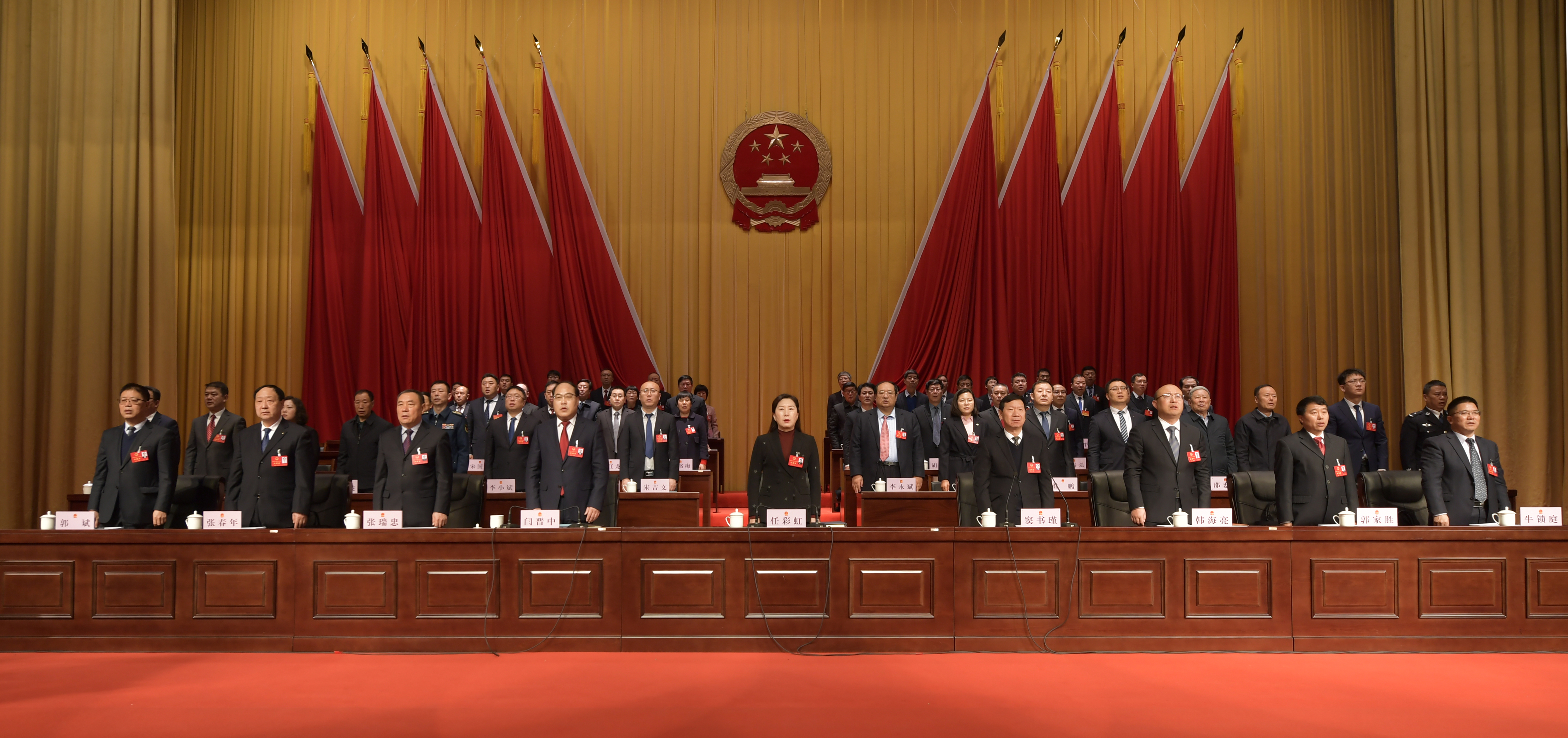 大会主席团常务主席、执行主席任彩虹、窦书瑾、闫晋中、韩海亮、张瑞忠、郭家胜、张春年、牛锁庭、郭斌在主席台前排就座。