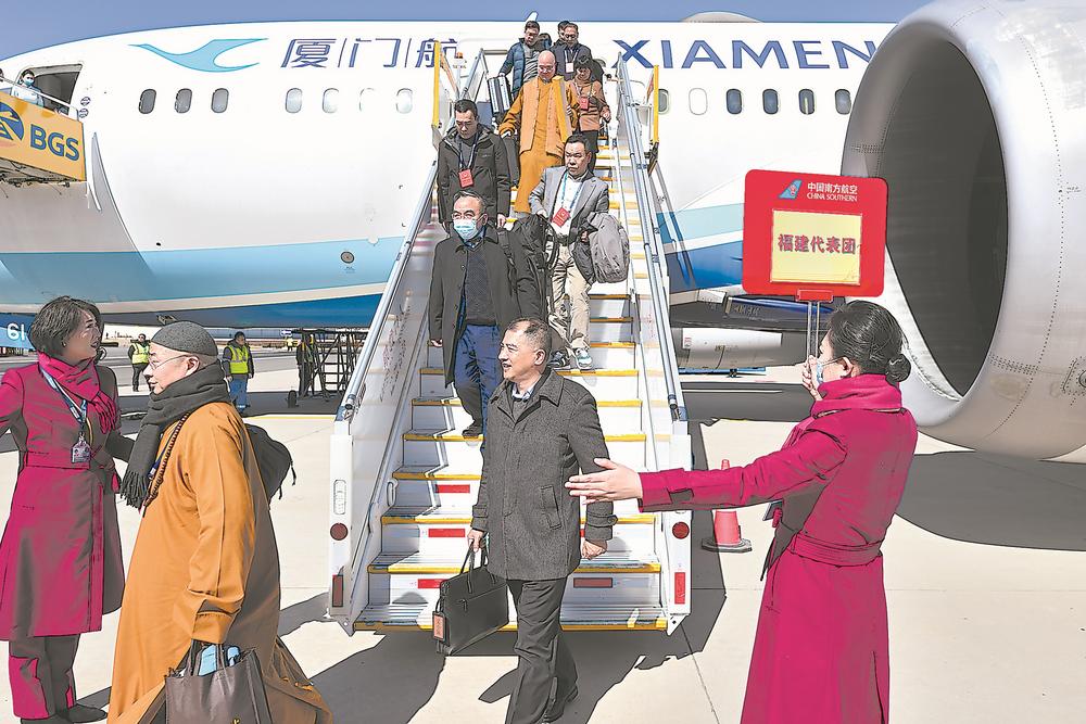 肩负着4100万福建人民的重托和期望,3月3日,出席十四届全国人大二次会议、全国政协十四届二次会议的福建省全国人大代表、住闽全国政协委员同机抵达北京(上图),向大会报到。