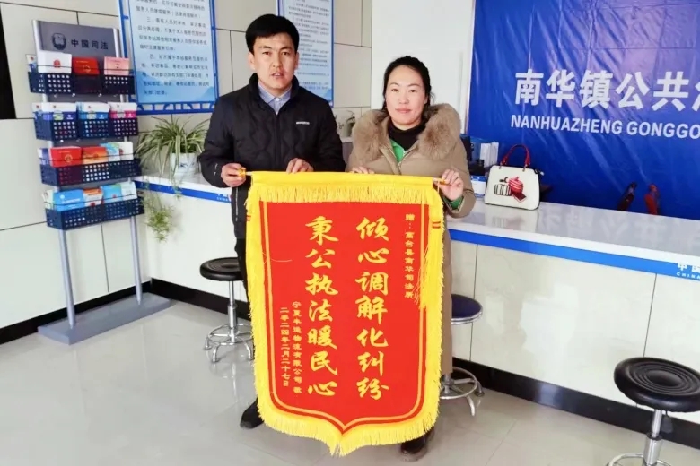 “非常感谢南华司法所全体工作人员,在你们的关心和帮助下,我的问题不仅得到了解决,还避免了一大笔经济损失,这份礼物请你们一定要收下!”近日,宁夏籍货运司机朱某将一面印有“倾心调解化纠纷,秉公执法暖民心”的殷红锦旗送到了南华司法所工作人员的手中,短短的两行字,溢满了他对南华司法所矛盾纠纷调解工作的认可。