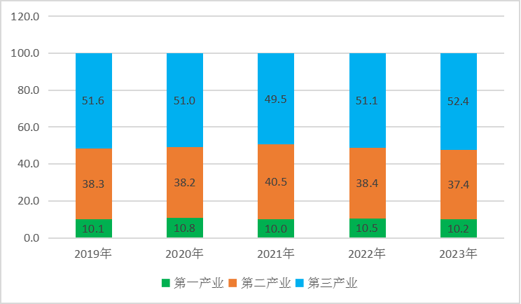 图2 2019-2023年三次产业增加值占全省生产总值比重(%)