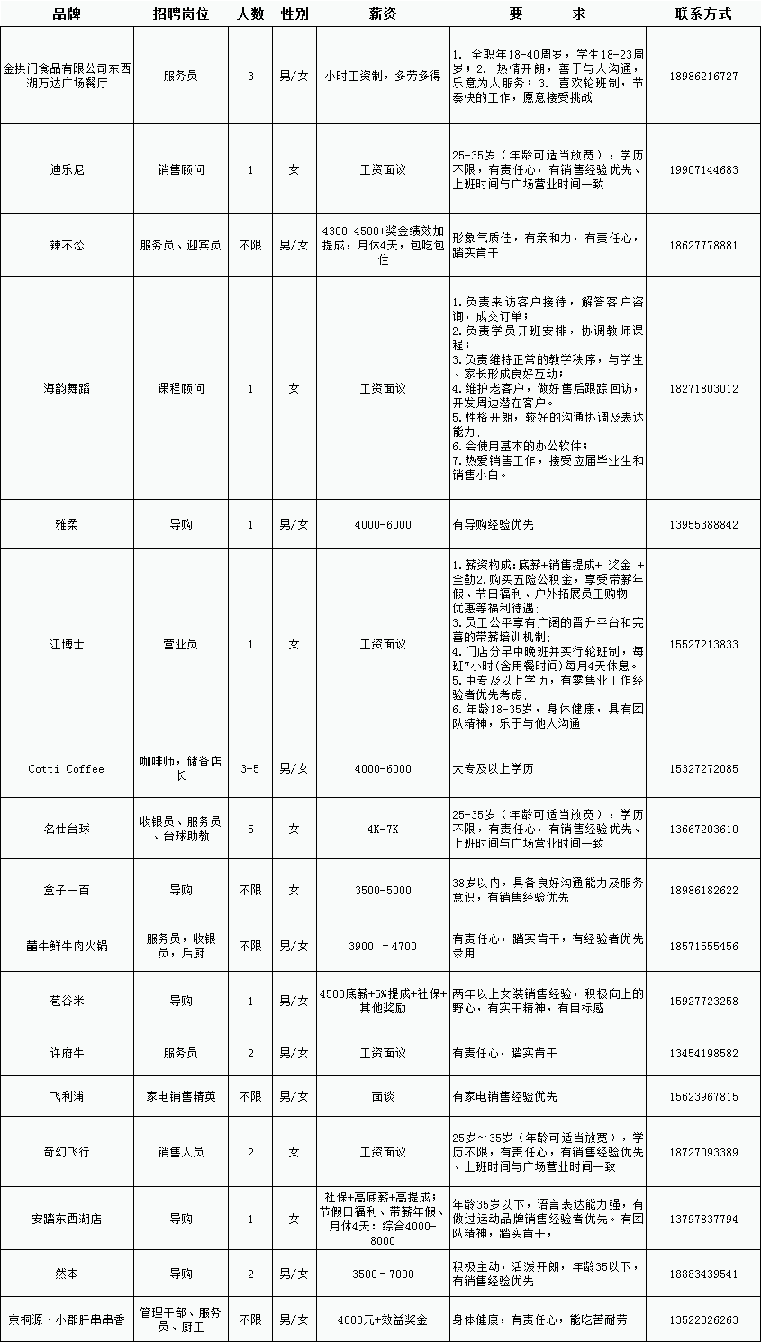 金银湖万达商户招聘岗位一览表