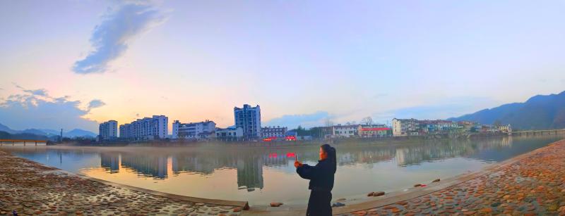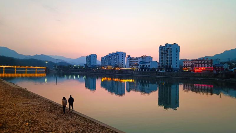 3月2日傍晚,在晓天镇晓天河畔,随着夜幕的缓缓降临,楼房、灯光、散步的居民,倒映在波光粼粼的河水中,一切显得温暖而柔美。(丁文新)