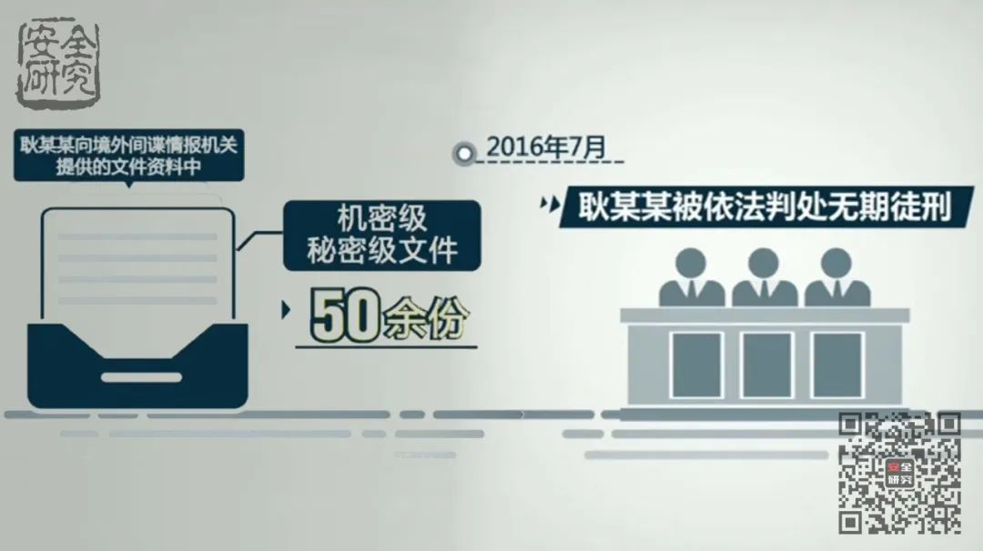 耿某某,曾在某国有企业驻外代表处任职。2007年,耿某某在驻外工作期间,因处理正常事务与当地安全部门人员结识。随后,对方以耿某某本人及其家人在境外的生命安全相威胁,将耿某某策反发展。此后,耿某某在对方指挥下,搜集我国国防军工科研领域大量涉密情况、我国驻该国使馆内部情况,以及我国在该国常驻机构、赴该国团组人员情况等,并在任期结束回国前接受了对方布置的回国“潜伏”任务,回国后继续与境外间谍情报机关保持秘密联系。经查,耿某某向境外间谍情报机关提供的文件资料中,机密级、秘密级文件50余份。2016年7月,耿某某被依法判处无期徒刑。
